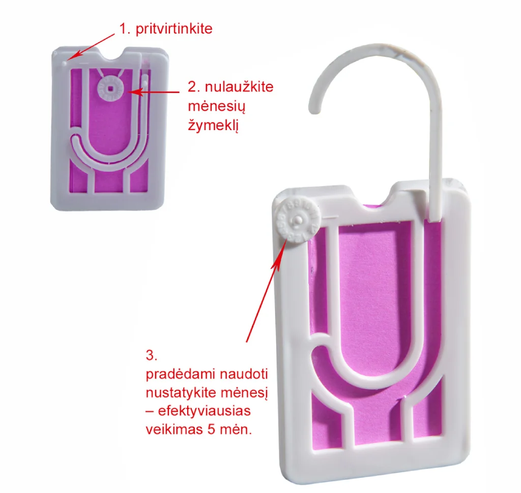 - Riidekapis: Riputage üks riputi kapi torule või ukse siseküljele. Üks toode kaitseb kuni 0,5 m² suurust pinda.
