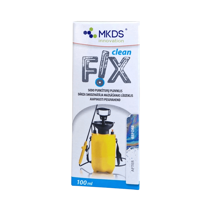- Valage uuesti sisse puhast vett 10% paagi mahust ja vajalik kogus vahendit FIX clean – kulunorm: 5 ml / 1 l vee kohta. Sulgege prits ja loksutage korralikult (umbes 2 min) igas suunas. Pritsige kogu lahus eraldi anumasse ohutus kohas. Selles etapis neutraliseeritakse pestitsiidide jäägid.