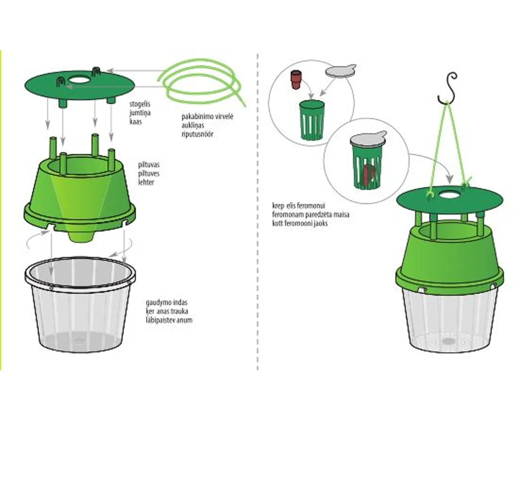 - Ettevalmistus: Kasutage töökindaid. Valage läbipaistvasse nõusse 2–3 cm vett ja lisage 3–4 tilka vedelseepi. Katke rohelise lehtri ja kaanega. Asetage feromoonipeibutis kaane ülaosas olevasse kotti ja sulgege see.