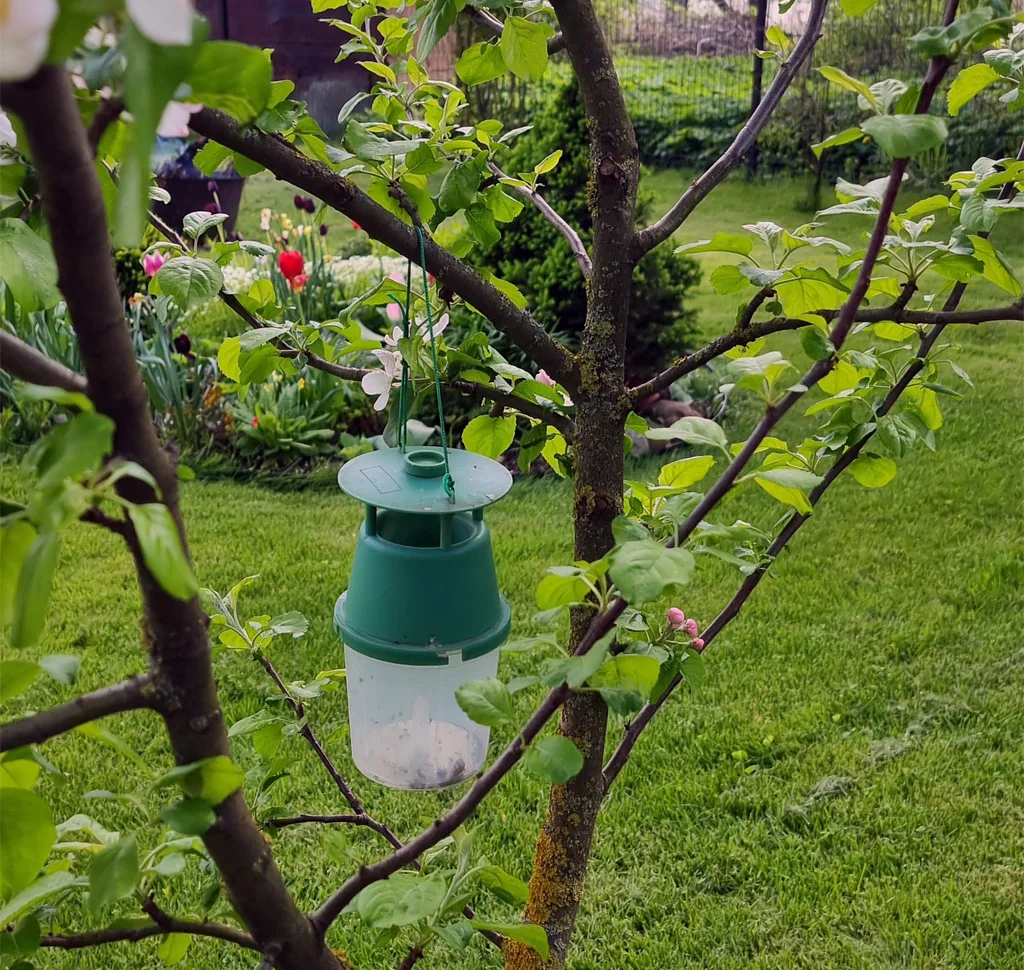 Riputage lõksud aia tuulepealsesse külge! Nii kandub feromooni lõhn üle kogu aia ja meelitab kahjurid viljapuudest eemale lõksu suunas. Kontrollige veetaset iga 1–2 nädala tagant, eriti kuumade ilmadega, ning eemaldage surnud putukad, et säilitada lõksu maksimaalne atraktiivsus.